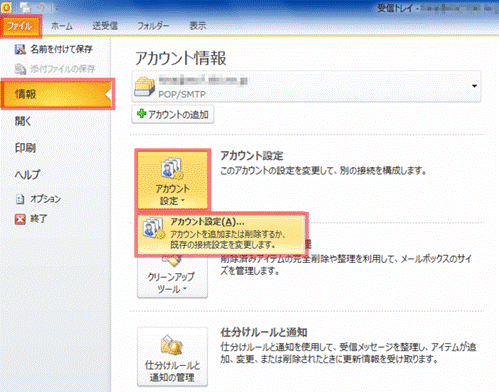 2. 【ファイル】→【情報】→【アカウント設定】→【アカウント設定】の順にクリックします