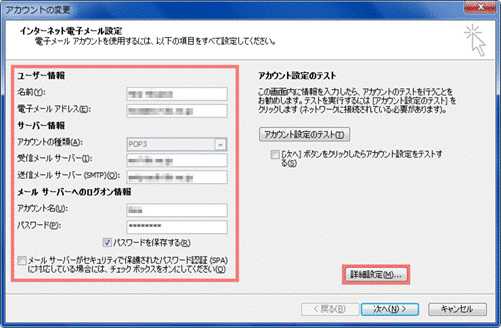 メールサーバーがセキュリティで保護されたパスワード認証 (SPA) に対応している場合には、チェック ボックスをオンにしてください |