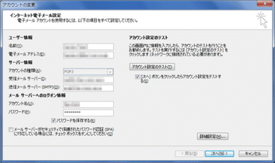 7. 「インターネット電子メール設定」の画面に戻ったら、「[次へ]ボタンをクリックしたらアカウント設定をテストする」のチェックが入っていることを確認した上で、[次へ]をクリックします。