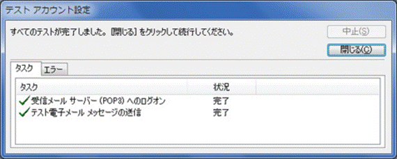 8. 【テスト アカウント設定】が開き、チェックが行われます。各タスクの状況が「完了」になれば、設定が正しく行われていることを示します。【閉じる】ボタンをクリックします。