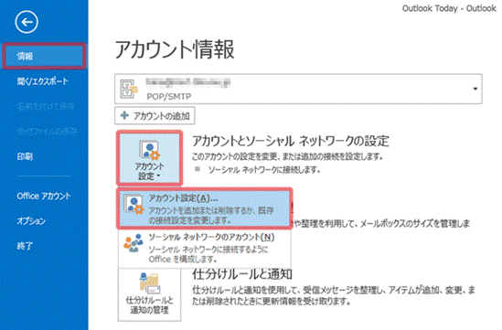 2. 【ファイル】<→【情報】→【アカウント設定】→【アカウント設定(A)】の順にクリックします