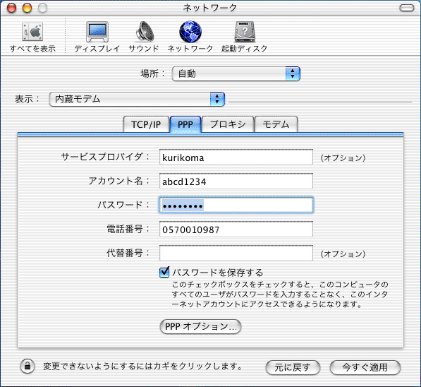 [電話番号]:アクセスポイントの電話番号 0570010987 を入力します。