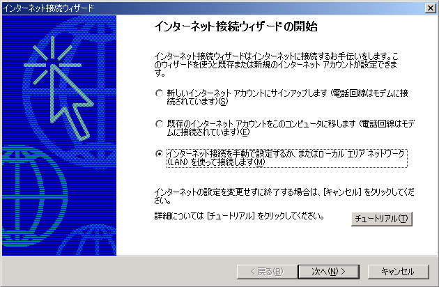 [インターネット接続を手動で設定するか、またはローカルエリアネットワーク(LAN)を使って接続します(M)]にチェックを入れ、[次へ]ボタンをクリックします。