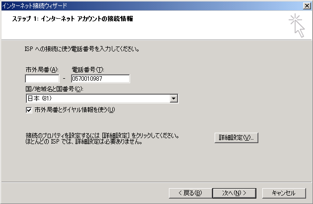 [電話番号(T)]:アクセスポイントの電話番号 0570010987 を入力します。PHSの場合は 0088363636を入力。