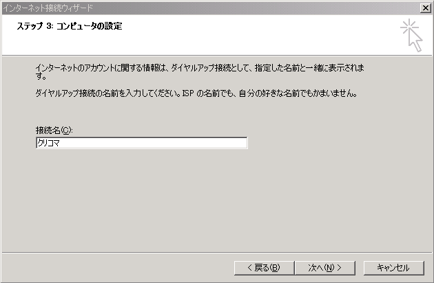 [接続名]に任意の名前を入力し(ここでは「クリコマ」と入力します)、[次へ]ボタンをクリックします。